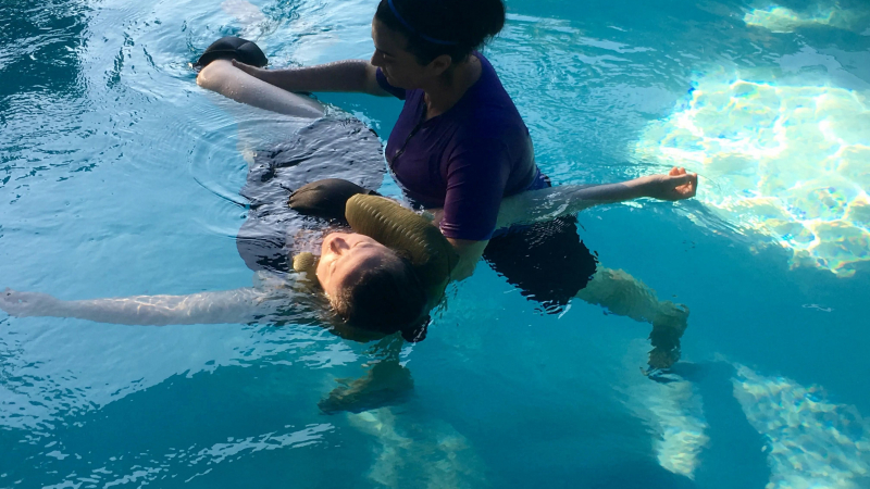 أثناء الجلسة، يقوم المُعالج بتحريك جسمك برفق في الماء في مكانٍ هادئ مع موسيقى هادئة.