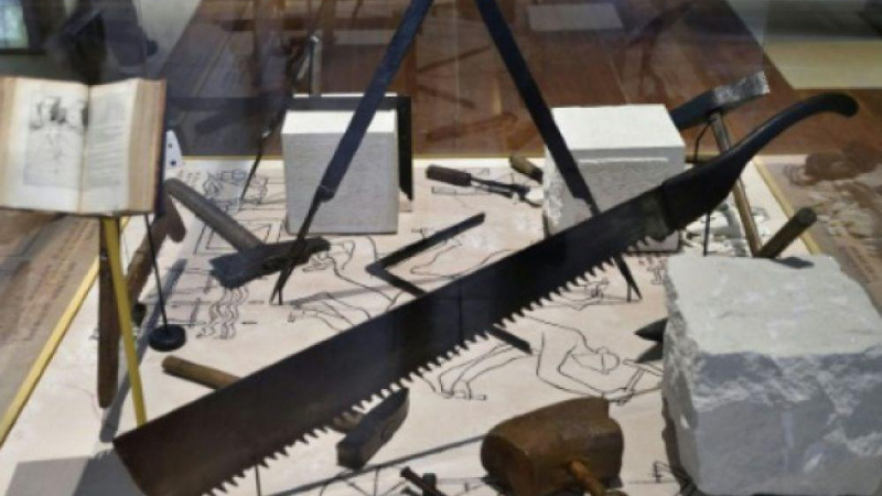 الأشياء المرتبطة مباشرة بممارسة مهنة البناء: المئزر، المطرقة، الإزميل، المسطرين، الشاقول، المسطرة، الفرجار.. وغيرها. ومواد البناء كالحجر، والمكعب.