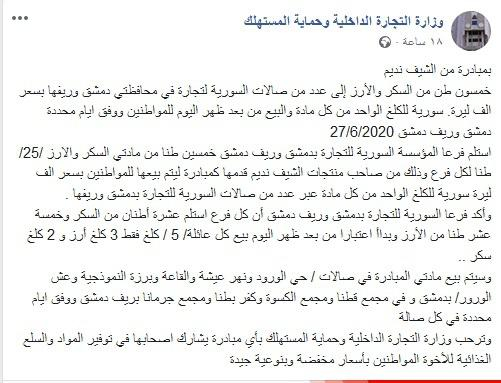 التجارة الداخلية تعلن عن مبادرة لمنتجات شركة غذائية ببيع 50 طن من الأرز والسكر بسعر 1000 ليرة للكيلو الواحد.. مواطن: عمتسموها مبادرة؟