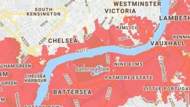 ووفقا للخريطة المرسومة، ستكون العاصمة لندن نفسها من أشد المدن تضررا، خاصة في جنوبها، فوفق التقديرات العلمية سوف تغمر المياه كل المناطق التي لا تتميز أراضيها بالارتفاع عن مستوى نهر التايمز مضافا إليه ارتفاع منسوب النهر بفعل ذوبان الجليد.