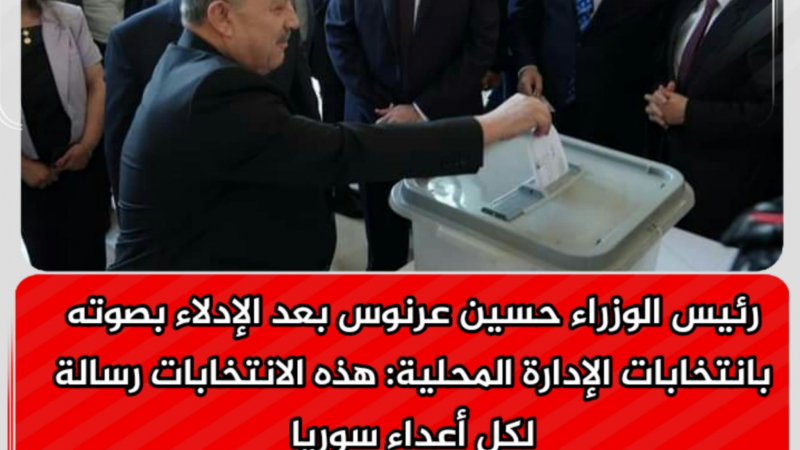 قال رئيس الوزراء السوري “حسين عرنوس” عقب الإدلاء بصوته في انتخابات الإدارة المحلية اليوم الأحد:«هذه الانتخابات رسالة لكل أعداء سوريا».