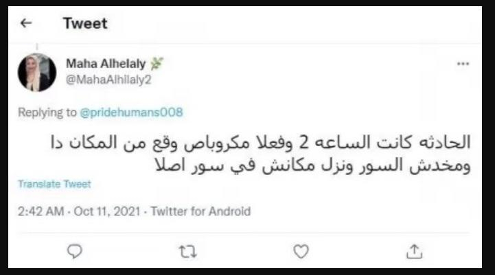 وأوضحت الهلالي في تدوينة عبر "تويتر": "اللي حصل امبارح إن عديت من المكان دا بالظبط بيني وبين السور عربيتين، وشفت غبار كتير طالع من الجزء المكسور من السور، وناس واقفة عنده وناس بتجري، وبتقول لسه الميكروباص واقع حالا بالناس، واللي اتقال بقا إنها خدت السور، ونزلت دا كلام فاضي لأنهم أكدوا أن مكانش في سور".