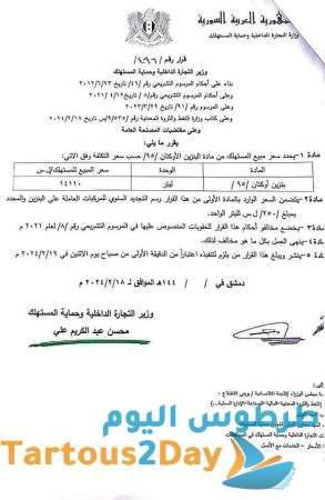 – البنزين اوكتان 90 بسعر 11000 لليتر الواحد – البنزين اوكتان 95 بسعر 14110 لليتر الواحد – المازوت الحر 12290 لليتر الواحد