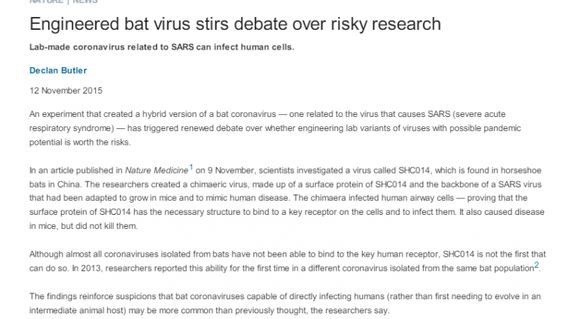 هذا التقرير نُشر في 12 نوفمبر 2015، وأفاد بأن علماء أمريكيين خلّقوا في المختبر نسخة هجينة من فيروس تاجي للخفافيش على علاقة بفيروس يسبب مرض "سارس"، أي متلازمة الجهاز التنفسي الحادة.