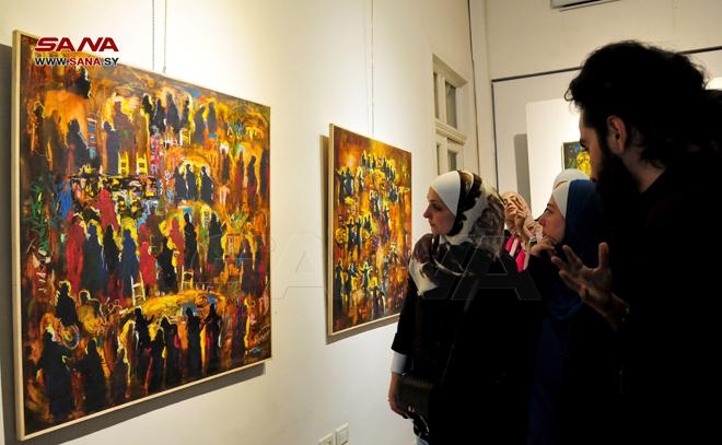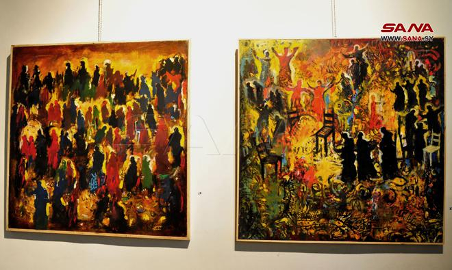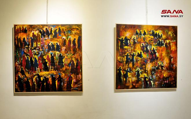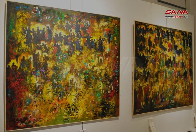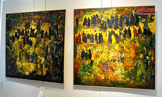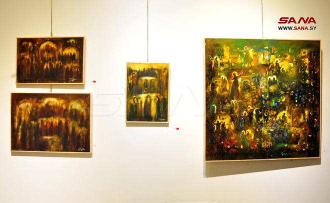 المعرض الذي تستضيفه صالة زوايا يضم 46 لوحة بأحجام متنوعة وبتقنية المواد المختلفة على قماش وبأسلوب تعبيري فيه الكثير من الأجواء المسرحية الكرنفالية والاحتفائية بحشود بشرية عديدة ومناسيب متراكبة وهالات نورانية تتخلل المساحات اللونية القاتمة في سعي لبث روح الأمل والمحبة في نفوس المشاهدين.