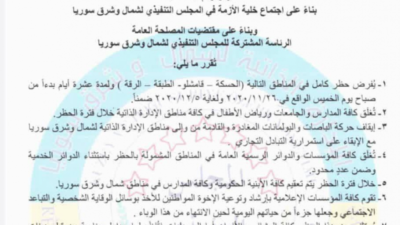 وشمل الحظر الكلي الذي أعلنته الرئاسة المشتركة للمجلس التنفيذي لشمال وشرق سوريا كلا من الحسكة، والقامشلي، والطبقة، والرقة.