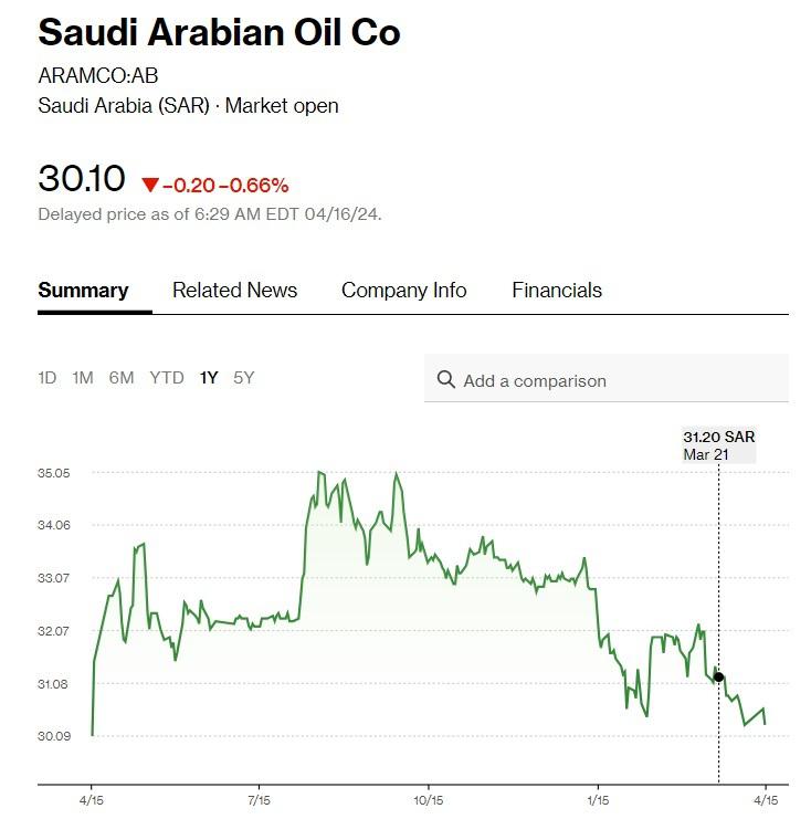 انخفض سهم شركة السعودية الحكومية "أرامكو"، في تعاملات اليوم الثلاثاء، إلى أدنى مستوى في نحو عام منذ نهاية أبريل من العام الماضي 2023.