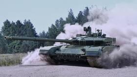 أرسلت شركة "أورال فاغون زافود" قطارا بأحدث الدبابات الروسية "تي – 90" (بروريف) إلى أوكرانيا حيث ينفذ الجيش الروسي عملية عسكرية خاصة ضد النازيين الأوكرانيين.