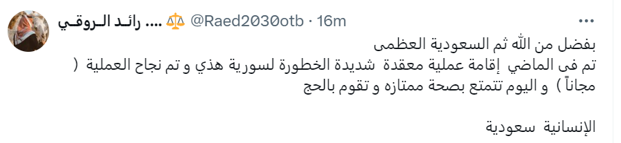 وتفاعل نشطاء على منصة "إكس" مع مقطع الفيديو، معربين عن اعتزازهم بالسعودية وقيادتها، حيث كتب أحدهم معلقا: "بفضل من الله ثم السعودية العظمى..تم في الماضي إقامة عملية معقدة شديدة الخطورة لسورية..وتم نجاح العملية (مجانا) واليوم تتمتع بصحة ممتازة وتقوم بالحج..الإنسانية سعودية"، وأضاف آخر: "لك الحمد يا الله على نعمة هذا البلد وحكامها".