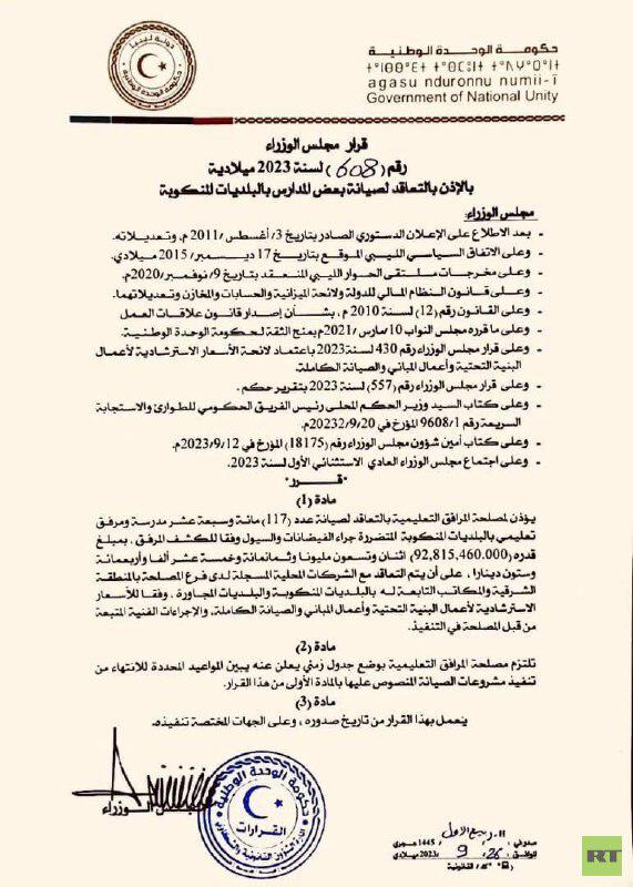 أصدر رئيس حكومة الوحدة الوطنية في ليبيا عبدالحميد الدبيبة، قرارا خصص بموجبه 92.8 مليون دينار لصيانة 117 مدرسة ومرفقا تعليميا بالمدن المتضررة جراء الفيضانات البالغ عددها 15 مدينة.