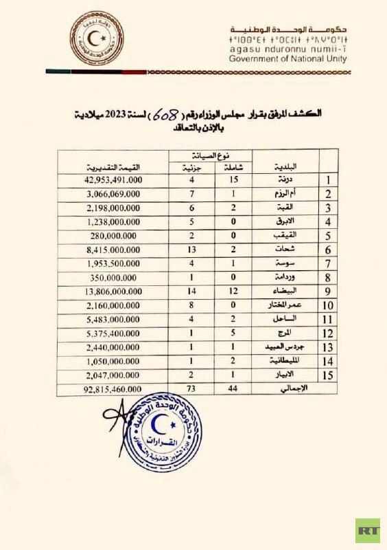 وأرفق الدبيبة مع قراره جدولا يتضمن البلديات وأعداد المدارس ونوع الصيانة والتكاليف المالية المقدرة للمرافق التعليمية المستهدفة في كل بلدية.