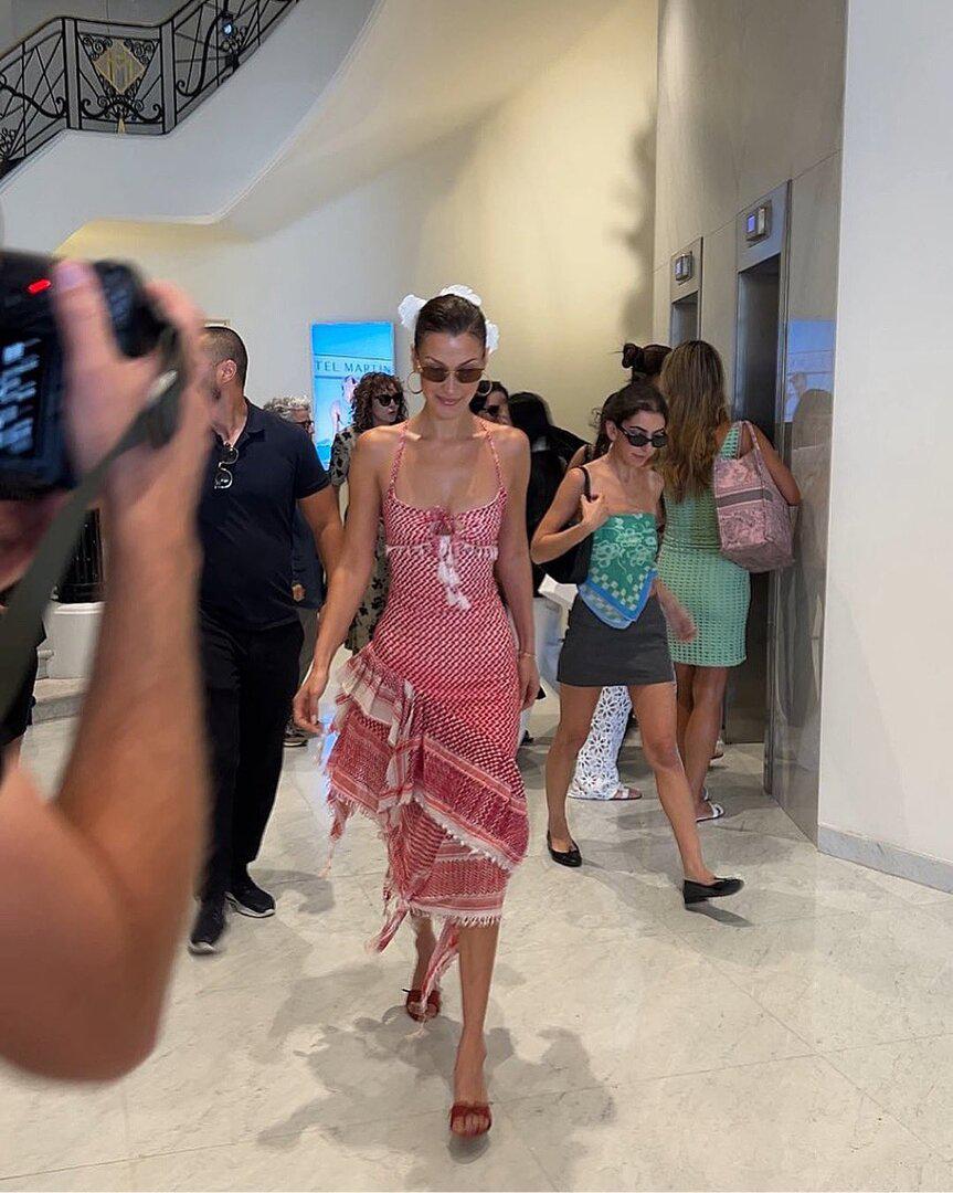 خطفت عارضة الأزياء الأمريكية من أصل فلسطيني بيلا حديد الأنظار خلال جولة لها في شوارع مدينة كان الفرنسية بفستان مستوحى من الكوفية.