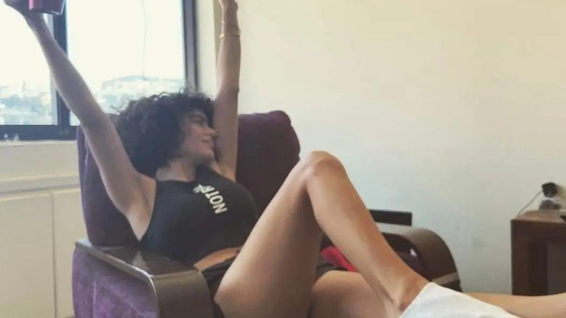 حيث ظهرت الممثلة السورية مستلقية على الكرسي، وهي مرتدية شورتاً قصيراً جداً أظهر كامل فخذيها.