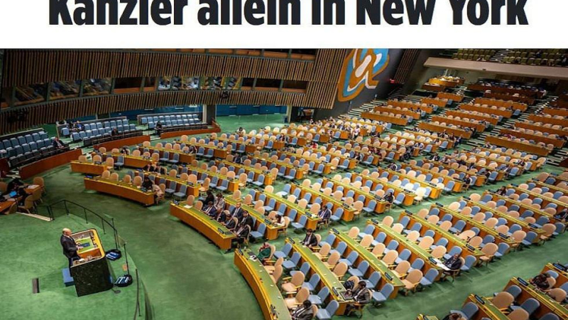 ألقى المستشار الألماني شولتس خطابه في الدورة الـ78 للجمعية العامة للأمم المتحدة أمام قاعة فارغة تقريبا من الحضور، وجاء خطابه مع نهاية اليوم الثاني لأعمال الجمعية ولذلك كان قد تبقى عدد قليل من الحضور للاستماع إلى خطاب المستشار.