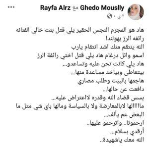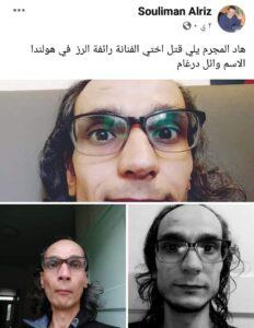 وقال شقيق الراحلة، الفنان التشكيلي “سليمان الرز”، إن من قتل شقيقته في “هولندا”، هو “وائل درغام”، مع نشر عدة صور له عبر صفحته الشخصية بالفيسبوك، دون إضافة أي تفاصيل أخرى، بدورها قالت صاحبة حساب باسم “Ghedo Moussly”: «هذا من قتل ابنة خالي رائفة الرز في هولندا، اسمو وائل درغام، هذا يلي كانت تحن عليه وتساعدو، بيتعاطى وبياخد مصاري منها، هجم عليها عالبيت وطلب مصاري، دافعت عن حالها، مالها بالمعارضة والسياسة ومالها بأي شي تاني متل ما عميألفوا البعض».